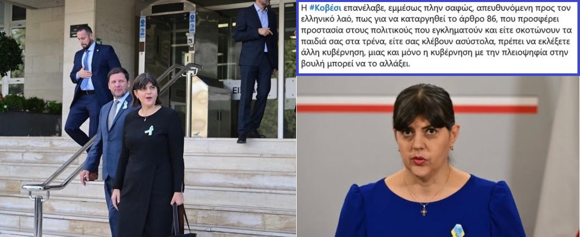 «Ακρωνύμιο διαφθοράς και νεποτισμού ο ΟΠΕΚΕΠ». Συνέντευξη Τύπου παραχώρησε η Ευρωπαία Εισαγγελέας, Λάουρα Κοβέσι, από το κτίριο του Γ’ Τελωνείου Πειραιά στο Πέραμα, σχολιάζοντας μεταξύ άλλων τα θέματα των Τεμπών και του ΟΠΕΚΕΠΕ. Κατά την έναρξη της ομιλίας της, η κυρία Κοβέσι έστειλε μήνυμα κατά της εγκληματικότητας, λέγοντας: «Θέλουμε να στείλουμε μήνυμα στους οργανωμένους εγκληματίες. Οι κανόνες του παιχνιδιού έχουν αλλάξει. Η επιχείρηση Καλυψώ ήταν μεγάλη επιτυχία αλλά πρέπει να την μετατρέψουμε σε συστηματική δουλειά».