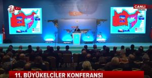 Εκεί παρουσίασε και χάρτη στον οποίο δεν υπάρχει κυπριακή ΑΟΖ παρά μόνο τουρκική «υφαλοκρηπίδα» η οποία φτάνει μέχρι την Κρήτη. Είναι σαφές ότι η Άγκυρα θέλει να εμποδίσει και την Ελλάδα να αποκτήσει μελλοντικά οικονομική δύναμη η οποία θα την καταστήσει σε βάθος χρόνου ισχυρότερη από την Τουρκία στο γεωπολιτικό και στο στρατιωτικό πεδίο.