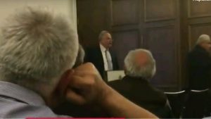 Τελικά η ένταση εκτονώθηκε όταν κάποιοι από τους διαμαρτυρόμενους απομακρύνθηκαν από την αίθουσα.