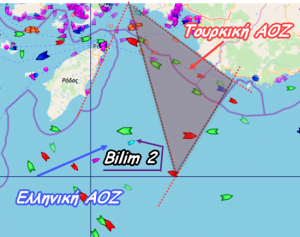 Το Bilim πλέει ανατολικά του Καστελορίζου και το συνοδεύει μία τουρκική φρεγάτα. Βρίσκεται σε διεθνή ύδατα, στο όριο του FIR Αθηνών και από πολύ κοντά παρακολουθεί την δραστηριότητά του μία Ελληνική πυραυλάκατος.