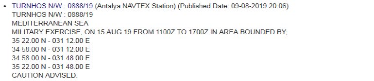Παράλληλα η Άγκυρα συνεχίζει την πίεση και με παράτυπες NAVTEX. Συγκεκριμένα ακόμα και την ημέρα του 15Αύγουστου η Τουρκία δεσμεύσει για στρατιωτική άσκηση στα δυτικά της Πάφου.