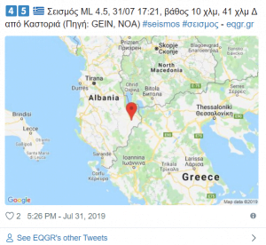 Σεισμική δόνηση μεγέθους 4,5 βαθμών της κλίμακας Ρίχτερ σημειώθηκε στις 5.22 μ.μ. την Τετάρτη 31/07/19 κοντά στα σύνορα Ελλάδας – Αλβανίας, σύμφωνα με εκτίμηση του Γεωδυναμικού Ινστιτούτου του Εθνικού Αστεροσκοπείου Αθηνών.