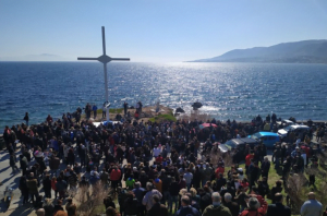 Συγκλονιστικές στιγμές στην Λέσβο καθώς εκατοντάδες κάτοικοι πήγαν στην γνωστή- για τις συγκρούσεις με την κυβέρνηση και τα ΜΑΤ-, ακτή Απελή και έψαλλαν το «τη Υπερμάχω» ενώ ακολούθησε αγιασμός στον μεγάλο Σταυρό της πίστης που έστησαν κάποια παλικάρια απέναντι σε ΜΚΟ, EΡΤ, ΜΑΤ και αλλοδαπούς.