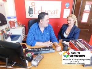 Η υποψήφια Ευρωβουλευτής υστερα από μια άκρως εποικοδομητική συζήτηση που είχε με τον πρόεδρο ΣΙΚΞΓ κ.Κουρούπη δήλωσε: Καταλήξαμε σε κάποια συμπεράσματα σχετικά με τα προβλήματα που ταλανίζουν το χώρο. Αρχικά το ζήτημα της βραδυκίνητης γραφειοκρατίας,που παρά την κοινοτική εντολή για άμεσο περιορισμό της,παραμένει πάντοτε ένα φλέγον πρόβλημα που δυσχεραίνει τις κάθε είδους διοικητικές πράξεις των εμπλεκομένων στο χώρο.Επίσης τα επιθετικά φορολογικά μέτρα που επιβάλλονται χωρίς καμία διάθεση εκλογίκευσης ενώ την ίδια στιγμή τη λαίλαπα των παράνομων ιδιαίτερων μαθημάτων δημιουργεί έναν έκνομο και άκρως αυθαίρετο ανταγωνισμό.Ας γίνει πια σε όλους μας κατανοητό ότι η γλωσσομάθεια προετοιμάζει τους νέους ανθρώπους για την εκπαιδευτική,επαγγελματική και επιστημονική τους ένταξη στο Ευρωπαϊκό στερέωμα και απαιτούνται άμεσα μέτρα προστασίας της