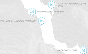 Τα ξενοδοχεία ειναι:Μayor Mon Repo palace Μον Ρεπό, Mayor Capo di Corfou Αγιος Πετρος στη Λευκίμμη , MayorPelekas Monastery Πελεκας και Mayor La grotta verde στη Γλυφάδα