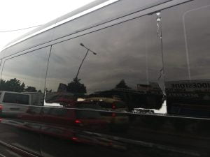 Σε άλλη περίπτωση πέτρα εκτινάχθηκε και χτύπησε τουριστικό βαν (βλέπε φωτό) και έσπασε το τζάμι ..Μέσα σε αυτό υπήρχαν τουρίστες οι οποίοι δεν μπορούσαν να πιστέψουν ότι διεκόπησαν οι διακοπές τους και περίμεναν να έρθει άλλο βάν επί ώρες για να συνεχιστούν αυτές…