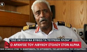 Ο αρχηγός του λιβυκού στόλου, Ναύαρχος Φάρατζ ελ Μαχντάουϊ, ο οποίος ανήκει στις δυνάμεις του στρατηγού Χαλιφά Χαφτάρ του Λιβυκού Εθνικού Στρατού, μίλησε στο κεντρικό δελτίο ειδήσεων του ALPHA και υπογράμμισε –μεταξύ άλλων- ότι «έχω εντολή να βυθίσω τα τουρκικά πλοία».