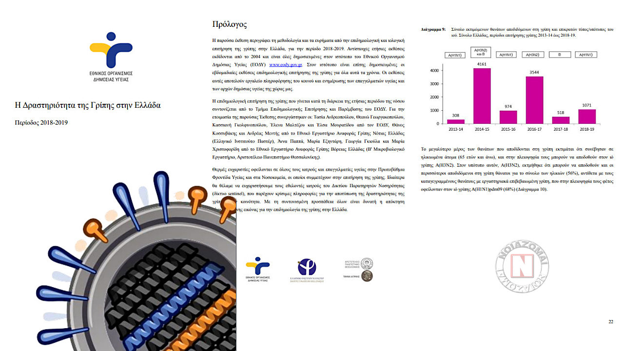Παρουσιάζουμε λοιπόν την επίσημη Έκθεση του ΕΟΔΥ για την Γρίπη στην Ελλάδα, με τίτλο “η Δραστηριότητα της Γρίπης στην Ελλάδα – περίοδο 2018 – 2019” για την οποία συνεργάστηκαν οι Τασία Ανδρεοπούλου, Θεανώ Γεωργακοπούλου, Κασσιανή Γκολφινοπούλου, Έλενα Μαλτέζου και Έλσα Μουρατίδου από τον ΕΟΔΥ, Θάνος Κοσσυβάκης και Ανδρέας Μεντής από το Εθνικό Εργαστήριο Αναφοράς Γρίπης Νότιας Ελλάδας (Ελληνικό Ινστιτούτο Παστέρ), Άννα Παππά, Μαρία Εξηντάρη, Γεωργία Γκιούλα και Μαρία Χριστοφορίδη από το Εθνικό Εργαστήριο Αναφοράς Γρίπης Βόρειας Ελλάδας (Β’ Μικροβιολογικό Εργαστήριο, Αριστοτέλειο Πανεπιστήμιο Θεσσαλονίκης), όπως αναφέρεται στον πρόλογο και άρα περιέχει αδιαμφισβήτητα και απολύτως τεκμηριωμένα στοιχεία!