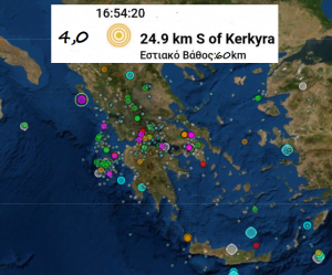 Σεισμός μεγέθους 4 Ρίχτερ σημειώθηκε στις 16:54 σε απόσταση 30 χιλιόμετρο νότια της Κέρκυρας.Σύμφωνα με το Ευρωμεσογειακό Ινστιτούτο το επίκεντρο εντοπίζεται 30 χλμ. νότια του νησιού και σε βάθος 60 χλμ.