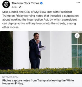Ο Mike Lindell, και μακροχρόνιος σύμμαχος του Προέδρου Ντόναλντ Τραμπ, φωτογραφήθηκε στο Λευκό Οίκο με μια χούφτα σημειώσεις που φάνηκε να απαιτούν την επιβολή στρατιωτικού νόμου στις Ηνωμένες Πολιτείες!