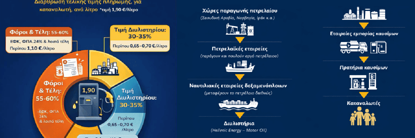 Η τελική τιμή που πληρώνει ο καταναλωτής για τα καύσιμα στο πρατήριο αποτελείται από τρία βασικά μέρη. Το μεγαλύτερο ποσοστό, περίπου 55-60%, είναι φόροι προς το κράτος, κυρίως ο Ειδικός Φόρος Κατανάλωσης (ΕΦΚ) και ο ΦΠΑ 24%. Περίπου το 30-35% της τιμής αντιστοιχεί στο κόστος του καυσίμου που πωλούν τα διυλιστήρια και το οποίο επηρεάζεται από τις διεθνείς τιμές του πετρελαίου. Το υπόλοιπο 5-10% αφορά το περιθώριο κέρδους των εταιρειών εμπορίας και των πρατηρίων καυσίμων.