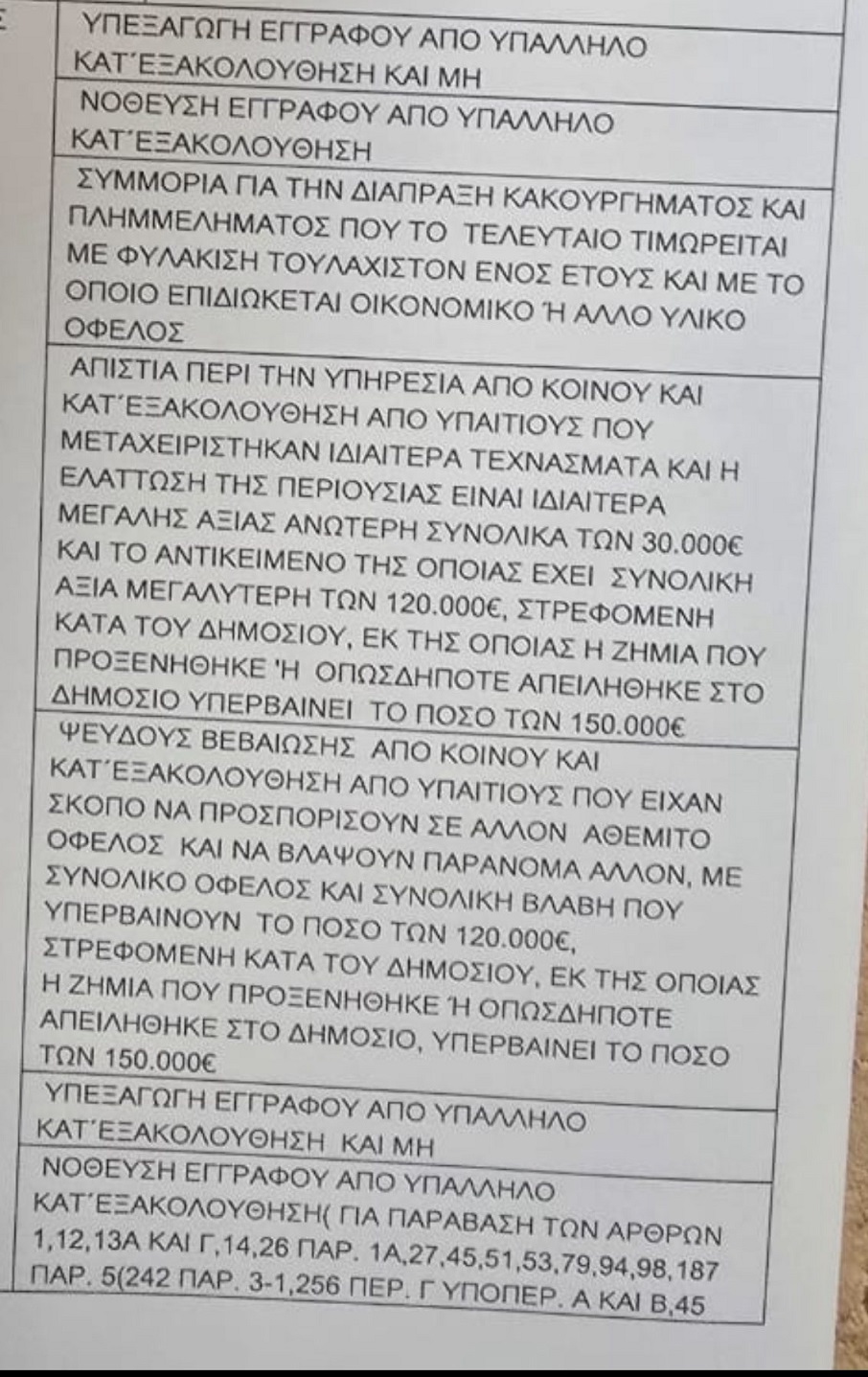 Η υπόθεση παραμένει ανοιχτή, με τις κατηγορίες να περιλαμβάνουν απιστία κατ’ εξακολούθηση, ψευδή βεβαίωση, υπεξαγωγή και νόθευση εγγράφων από υπαλλήλους, όλα στρεφόμενα κατά του Δημοσίου και με ιδιαίτερα υψηλό ύψος ζημίας.