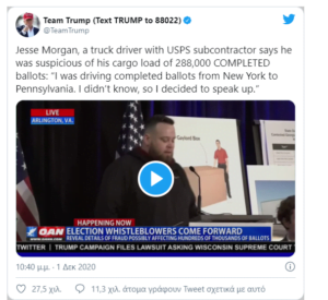 Μάλιστα οι ισχυρισμοί Μπάιρν για τον τρόπο που έγινε η νοθεία επιβεβαιώνονται από οδηγό φορτηγού της USPS ο οποίος αποκάλυψε ότι μετέφερε σχεδόν 300.000 ψήφους από τη Νέα Υόρκη στο… Λάνκαστερ της Πενσυλβάνια!