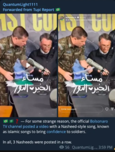 Επίσης, ενδιαφέρον παρουσιάζει ότι το επίσημο τηλεοπτικό κανάλι του Μπολσονάρο δημοσίευσε, για κάποιο περίεργο λόγο, ένα βίντεο με ένα τραγούδι σε στυλ Nasheed, γνωστό ως ισλαμικά τραγούδια για να φέρουν αυτοπεποίθηση στους στρατιώτες…Συνολικά, αναρτήθηκαν 3 Nasheed στη σειρά…
