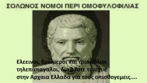 Διαβάστε τι γράφει δημοσίευμα απο το https://apagoreuetai-group.blogspot.com/ σχετικά με το Νόμο Σόλωνος στην Αρχαία Ελλάδα γιατι τα παπαγαλάκια της Τηλεόρασης θέλουν να τα διαστρεβλώσουν ολα αρκεί να περάσει ο ΚΟΥΛΗΣ το Νομο για Υιοθεσία & Γάμο ανωμάλων..
