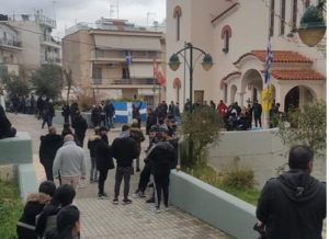 Συγκεντρώθηκαν χθες 03/04/20 έξω από την εκκλησία κρατώντας στα χέρια σημαίες και σταυρούς ψάλλοντας τροπάρια και ύμνους.Η συγκέντρωση – διαμαρτυρία κράτησε περίπου μισή ώρα.
