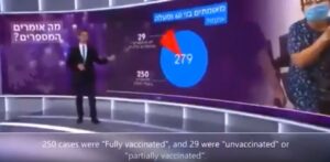 Όπως αναφέρει ο τηλεοπτικός σταθμός kann του Ισραήλ στη χώρα αυτή υπήρξαν 279 ημερήσια κρούσματα στην ηλικιακή ομάδα 60 άνω από τους οποίους οι 250 ήταν πλήρως εμβολιασμένοι και οι 29 ανεμβολίαστοι ή μερικώς εμβολιασμένοι.Ο δημοσιογράφος λέει δείχνοντας τη σχετική κάρτα:Nα πως αυτό αποτυπώνεται σε ποσοστά σε 90% που ήταν εμβολιασμένοι και 10% ανεμβολίαστοι ή μερικώς εμβολιασμένοι.
