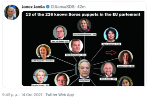 Ο Janez Jansa από εκείνη τη στιγμή βρέθηκε στο στόχαστρο του ευαγούς φιλανθρωπικού ολιγαρχικού οργανισμού ΕΕ.Στις 14 και 15/10/21 Ευρωβουλευτές, καθώς και ο Ολλανδός πρωθυπουργός, επέκριναν έντονα μια δημοσίευση του επικεφαλής της κυβέρνησης της Σλοβενίας, ο οποίος ασκεί την εκ περιτροπής προεδρία της ΕΕ. Ο Janez Jansa, από την πλευρά της, υπερασπίζεται τον εαυτό της από κάθε συνωμοσία. Επιβάλλοντας τους «φαντασιακούς ευρωπαϊκούς αξίες» κινδύνους που οδηγούν την ΕΕ σε κατάρρευση, σύμφωνα με τη Jansa. Μετά το σάλο που δημιουργήθηκε και την ομοβροντία επίθεσης των Ευρωενωσιακών κατά του Σλοβένου Πρωθυπουργού ο τελευταίος διαγράφει το tweet του, αλλά δεν ανακαλεί.Είχε αναρτήσει φωτογραφία που απεικόνιζε έναν πίνακα που συνδέει τον Georges Soros – αμφιλεγόμενο Αμερικανό δισεκατομμυριούχο ουγγρικής καταγωγής και ιδρυτή των Open Society Foundations – με πολλούς ευρωβουλευτές, συμπεριλαμβανομένης της Sophie in ‘t Veld, που περιγράφονται ως “Μαριονέτες” του χρηματοδότη George Soros.