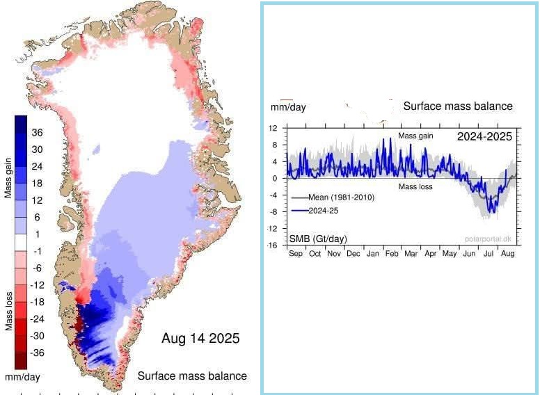 Εδώ είναι η πραγματικότητα → “Ισοζύγιο μάζας επιφάνειας” = χιονόπτωση μείον τις απορροές. Κατά τη διάρκεια ενός χρόνου, είναι πάντα θετικό. Το στρώμα πάγου δεν λιώνει απλά – κερδίζει μάζα τις περισσότερες φορές.