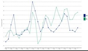 Όπως φαίνεται στο γράφημα που ακολουθεί, η Ελλάδα (με πράσινο χρώμα) απέχει σημαντικά από την Ευρώπη, με την έντονα ανοδική πορεία να έχει ξεκινήσει από τον Ιανουάριο του 2021.