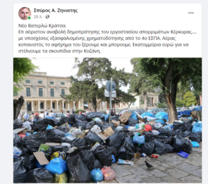 Απο τη στιγμή που η ΑΡΧΙ-ΣΚΟΥΠΙΔΑΡΧΗΣ Ροδη Κράτσα και η ΥΠΟ-ΣΚΟΥΠΙΔΑΡΧΗΣ Μερόπη Υδραίου ακύρωσαν τον Διαγωνισμό και δεν κάνουν ανακύκλωση για να μεταφέρει ο εξ Ιωαννίνων ΕΡΓΟΛΑΒΟΣ οσο γίνεται περισσότερα σκουπίδια για περισσότερα ακόμη Χρόνια ηταν και είναι ξεκάθαρο το ΒΡΩΜΙΚΟ ΠΟΛΙΤΙΚΟ ΠΑΙΧΝΙΔΙ ΤΟΥΣ σε βαρος των Κερκυραιων…Εθεσαν ως Προτεραιότητα την Μεταφορά των σκουπιδιών και τους Εργολάβους να εισπράττουν 10-12 εκατομμύρια ευρω σε ΒΑΡΟΣ των ΠΟΛΙΤΩΝ της Κέρκυρας..