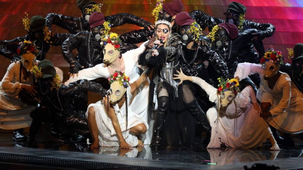 Η Madona πλαισιώθηκε απο 20 χορευτές που αριθμολογικά μας πήγαινε στο 2020 και οι λαοί εμφανίζονταν με μάσκες που θανατώνονταν με ψεκασμούς θανατηφόρων αερίων.