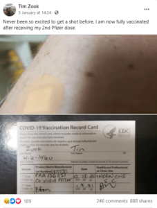 Ο Tim Zook, από τη Santa Ana στην Καλιφόρνια, είχε γράψει στο Facebook στις 5 Ιανουαρίου.: «Ποτέ δεν ήμουν τόσο ενθουσιασμένος μετά από εμβολιασμό. Τώρα είμαι πλήρως εμβολιασμένος μετά και τη λήψη της 2ης δόσης του εμβολίου της Pfizer».