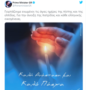 Την “Καλή Ανάσταση” που δήθεν εύχεσαι στον ελληνικό λαό μέσα από την ανάρτησή σου στο Twitter, να την ευχηθείς πρώτα στον εαυτό σου, στους 300 χαραμοφάηδες της Βουλής, στην κυβέρνησή σου και στην επιτροπή των ακαταδίωκτων ψευτοειδικών σου που με την τρομοκρατία τους έσβησαν το χαμόγελο από τον ελληνικό λαό τα τελευταία δυόμιση χρόνια και πολλούς τους οδήγησαν πρόωρα στον άλλο κόσμο. Χωρίς τη δική σας ανάσταση της συνείδησης δεν υπάρχει ελπίδα για τον ελληνικό λαό έτσι μοιραίο κι άβουλο που τον καταντήσατε.