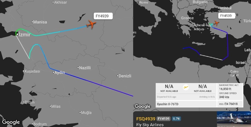 Αεροσκάφος μεταφοράς εμπορευμάτων Ilyushin IL-76TD της Fly Sky Airlines, ουραίος αριθμός EX-76018 με διαδρομή: Βεγγάζη, Λιβύη προς Σμύρνη, Τουρκία. Ημερομηνίες: Τουλάχιστον τρεις πτήσεις καταγράφηκαν μεταξύ 14ης και 15ης Σεπτεμβρίου.