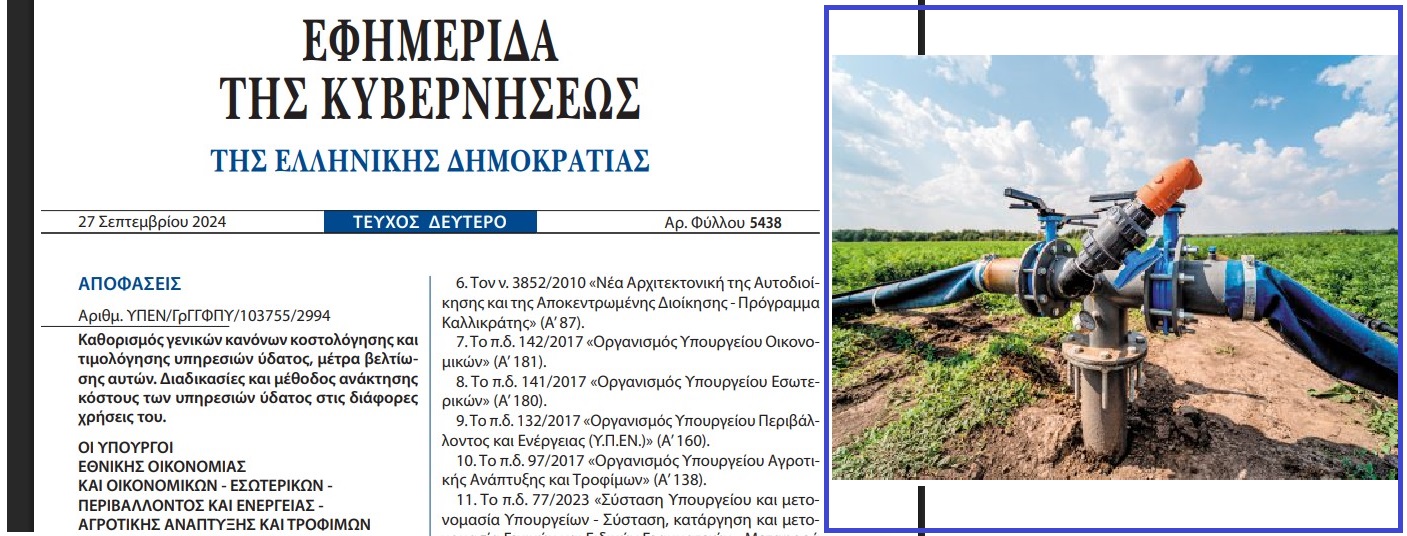 Την υποχρέωση να εγκατασταθούν σε όλες τις αγροτικές εκμεταλλεύσεις υδρόμετρα έως το τέλος του 2026, είτε έχουν γεώτρηση είτε ανήκουν σε συλλογικά αρδευτικά δίκτυα (ΓΟΕΒ-ΤΟΕΒ), προβλέπει Κοινή Υπουργική Απόφαση που δημοσιεύθηκε στην Εφημερίδα της Κυβερνήσεως (ΦΕΚ Β΄ 5438/2024).