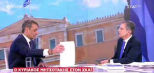 Τον ρωτάει ο Δημοσιογράφος για την τροπολογία για το κόμμα Κασιδιάρη και ο Μητσοτάκης απλώνει το χέρι και πιάνει ένα φύλλο χαρτί και το βάζει μπροστά του και διαβάζει από μέσα…..