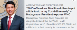 Ο ΠΑΓΚΟΣΜΙΟΣ ΟΡΓΑΝΙΣΜΟΣ ΥΓΕΙΑΣ ΠΡΟΣΠΑΘΗΣΕ ΝΑ ΕΞΑΓΟΡΑΣΕΙ ΤΟΝ ΠΡΟΕΔΡΟ ΤΗΣ ΜΑΔΑΓΑΣΚΑΡΗΣ ΜΕ 20 ΕΚΑΤ. ΔΟΛΑΡΙΑ ΓΙΑ ΝΑ ΠΡΟΣΘΕΣΕΙ ΤΟΧΙΝΕΣ ΣΕ ΑΠΟΤΕΛΕΣΜΑΤΙΚΟ ΦΑΡΜΑΚΟ ΠΟΥ ΠΑΡΑΣΚΕΥΑΣΕ Η ΧΩΡΑ ΤΟΥ ΚΑΤΑ ΤΟΥ COVID-19