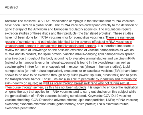 «Στην πραγματικότητα, διαπίστωσαν ότι οι γυναίκες που βρισκόταν σε κοντινή απόσταση —σε απόσταση μικρότερη των δύο μέτρων, εκτός του σπιτιού— από εμβολιασμένα άτομα, παρουσίαζαν σημαντική αύξηση των ανωμαλιών στον εμμηνορροϊκό κύκλο».