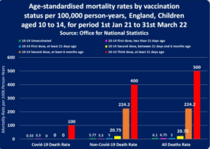 Τα δεδομένα του ONS δείχνουν ότι μεταξύ 1ης Ιανουαρίου 21 και 31ης Μαρτίου 22, παιδιά ηλικίας 10-14 ετών με τριπλό τρυπήματα είχαν στατιστικά 303 φορές περισσότερες πιθανότητες να πεθάνουν από τα μη εμβολιασμένα παιδιά του Covid-19, 69 φορές περισσότερες πιθανότητες να πεθάνουν από οποιαδήποτε άλλη αιτία εκτός από τον Covid-19. από τα μη εμβολιασμένα παιδιά και 82 φορές περισσότερες πιθανότητες να πεθάνουν από όλες τις αιτίες από τα μη εμβολιασμένα παιδιά.