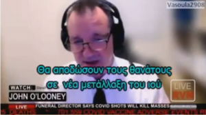 Ο άνθρωπος που τα επιβεβεβαιώνει και αποκαλύπτει εν γνώσει του ρισκάρει τη ζωή του. Πρόκειται για τον Τζον Ο Λουνευ .Μιλα για ΑΠΑΤΗ και χρέωση θανάτων στον Covid για το αρχικό στάδιο και τωρα με τη χορήγηση του σκευάσματος κινδυνεύουν ολοι οσοι το βάζουν στο σώμα τους. Υπάρχει μια οργανωμένη ατζέντα αποπληθυσμού που σκοτώνει συγκεκριμένες ηλικίες και στειρώνει τους νεους.