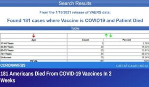 Σύμφωνα με τη βάση δεδομένων , η οποία είναι πιθανό να μην ανοίγει από IP Ευρωπαικής Ένωσης, αλλά τα στοιχεία υπάρχουν εδώ , 181 Αμερικανοί πέθαναν από εμβόλια COVID-19 σε 2 εβδομάδες.