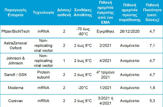 Από τα παραπάνω, τα Pfizer/BioNTech και Moderna, αμφότερα τεχνολογίας mRNA, απαιτούν για την αποθήκευση και διανομή τους πανεθνικό δίκτυο βαθιάς κατάψυξης (με το παράδοξο εδώ, το εμβόλιο της Curevac, επίσης τεχνολογίας mRNA, να μ η ν απαιτεί βαθιά κατάψυξη αλλά θερμοκρασίες οικιακού ψυγείου 2 έως 8° C.. [βλ. εδώ σχετικά στοιχεία Εθνικού Επιχειρησιακού Σχεδίου Εμβολιασμού https://drive.google.com/…/15ZIXbWNEaZdS2gg4r0C…/view…].