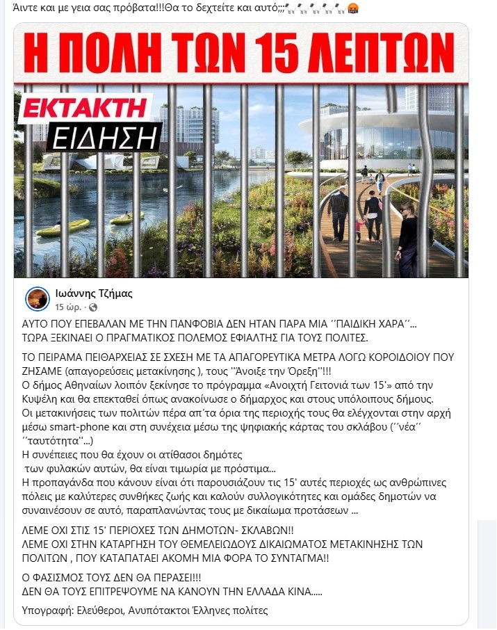 Η προπαγάνδα που κάνουν είναι ότι παρουσιάζουν τις 15′ αυτές περιοχές ως ανθρώπινες πόλεις με καλύτερες συνθήκες ζωής και καλούν συλλογικότητες και ομάδες δημοτών να συναινέσουν σε αυτό, παραπλανώντας τους με δικαίωμα προτάσεων …