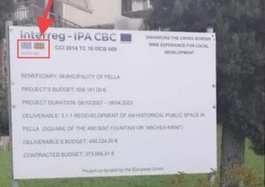 Στην πινακίδα του έργου ανάπλασης της αρχαίας Κρήνης στην Πέλλα την γενέτειρα του Μέγα Αλέξανδρου υπάρχει η σημαία των Σκοπίων με τον Ηλιο της Βεργίνας!!!