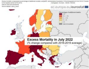 Τα νέα στοιχεία δείχνουν ότι απέχουμε πολύ από το τέλος του προβλήματος, τα υπερβολικά ποσοστά θνησιμότητας συνεχίζουν να αυξάνονται. Αυτή τη στιγμή κυκλοφορεί στα μέσα κοινωνικής δικτύωσης μια συλλογή που συζητά την υπερβολική θνησιμότητα των ευρωπαϊκών χωρών τον Ιούλιο του 2022 – σε σύγκριση με τον ετήσιο μέσο όρο της περιόδου 2016-2019: