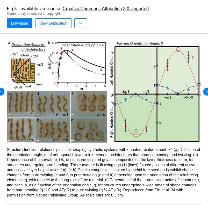 Προφανώς, οι ερευνητές έχουν αναπτύξει συνθετικές δομές που μπορούν να αλλάζουν μορφή από μόνες τους χρησιμοποιώντας στρατηγικές που εφαρμόζουν οι βιολογικές μορφές ζωής. Μερικά παραδείγματα αυτού είναι συνθετικές δομές που κάμπτονται και στρίβουν για να σχηματίσουν ελικοειδείς δομές, όπως αυτές που βρίσκονται στα αναρριχώμενα φυτά. «Ο βιοεμπνευσμένος σχεδιασμός και η δημιουργία αυτοδιαμορφούμενων μικροδομών αντιπροσωπεύουν μια νέα οδό για τον προγραμματισμό αλλαγών μορφής σε συνθετικά υλικά» (Studart και Randall «Bioinspired materials that self-shape through programmed microstructures. 2014» (Βιοεμπνευσμένα υλικά που αυτοδιαμορφώνονται μέσω προγραμματισμένων μικροδομών 2014) :