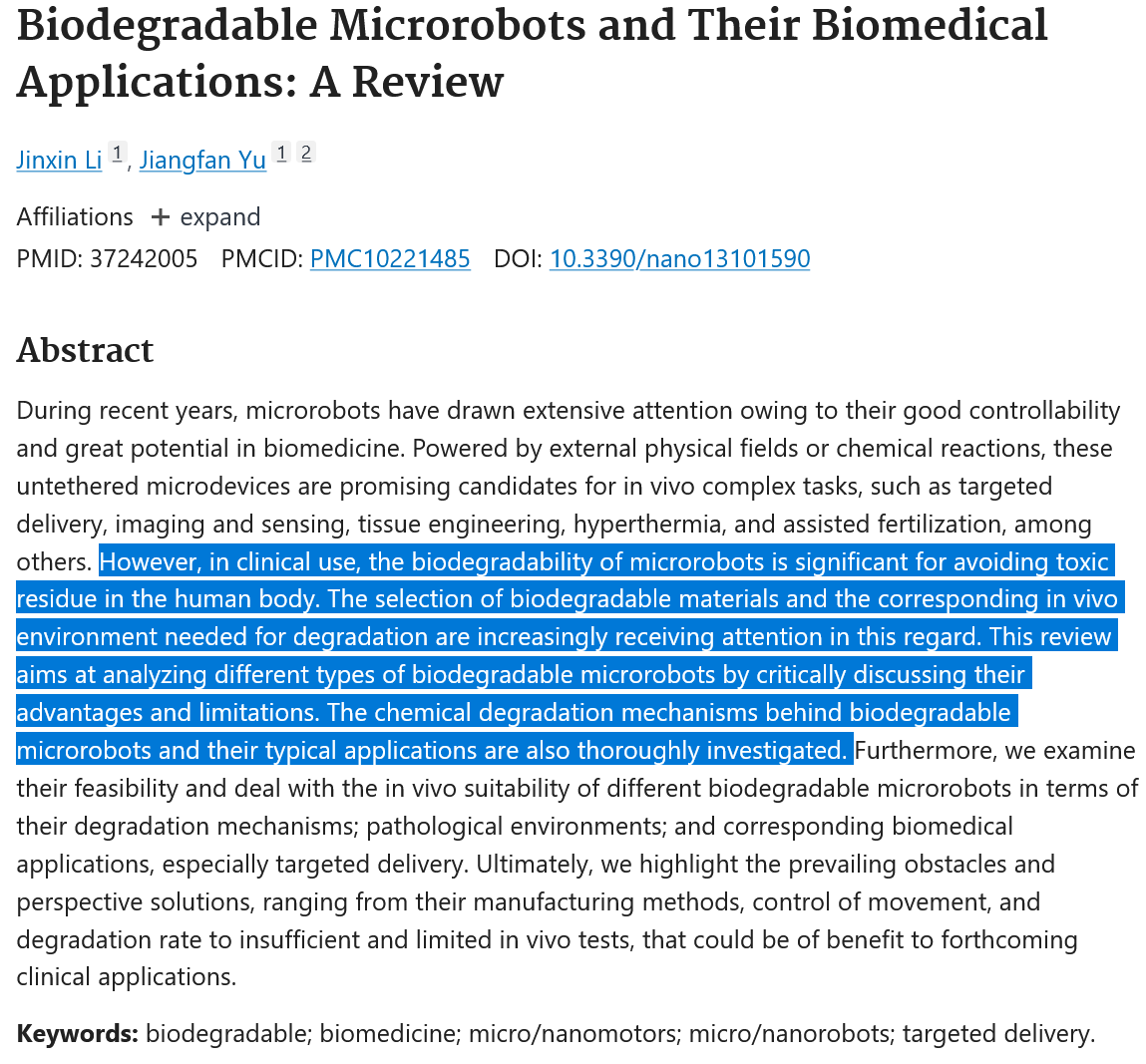 Ορισμένες ερευνητικές εργασίες εξετάζουν στρατηγικές για τη δημιουργία τεχνητών δομών που αποσυντίθενται, ώστε να ελαχιστοποιείται ο κίνδυνος για την ανθρώπινη υγεία (Li, Jinxin και Lu, Jianfan – «Biodegradable Microrobots and Their Biomedical Applications: A Review» 2023 (Βιοδιασπώμενα μικρορομπότ και οι βιοϊατρικές τους εφαρμογές: Μια ανασκόπηση 2023). Φανταστείτε το!