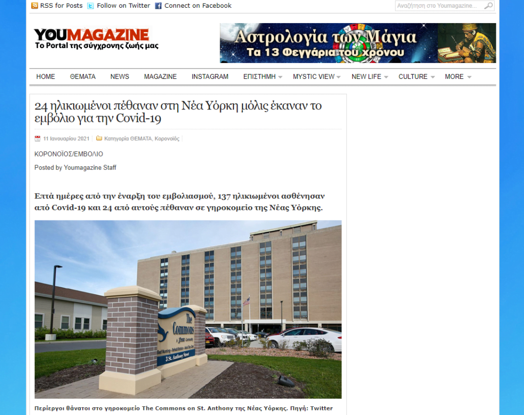 Υπάρχουν ακομη 24 Νεκροι σε Γηροκομείο της Νεας Υόρκης αλλα εκει αναφέρουν οτι πέθαναν πριν τον εμβολιασμό.Η υπόθεση ερευνάται μήπως είναι απόκρυψη..