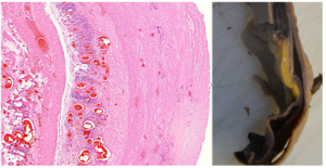 Αριστερά, τομή του τοιχώματος μιας αορτής. Αυτή η εικόνα έχει ληφθεί σε ακόμη μικρότερη μεγέθυνση από την προηγούμενη- τα λεμφοκύτταρα εμφανίζονται τώρα ως ένα σύννεφο μικροσκοπικών μπλε κηλίδων. Στα αριστερά αυτού του μπλε νέφους, βλέπουμε μια κάθετη ρωγμή που διατρέχει τον ιστό. Μια τέτοια ρωγμή είναι επίσης ορατή μακροσκοπικά στο δείγμα αορτής που αφαιρέθηκε και απεικονίζεται στα δεξιά.