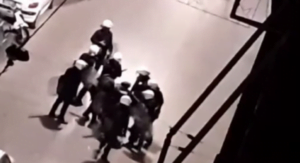 Στο βίντεο φαίνονται δέκα αστυνομικοί, με ασπίδες, κράνη και γκλοπ να έχουν ρίξει στο έδαφος ένα άτομο και κάποιοι να τον χτυπούν.